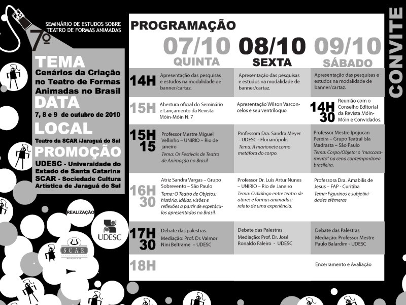 Este mês está intensamente movimentado. Além de estar escrevendo o material para qualificação da minha dissertação: Alumbramentos de um Corpo em Sombras: o Sombrista da Cia Teatro Lumbra de Animação estou coordenando, juntamente com o Professor Dr. Valmor Nini Beltrame, o 7º Seminário de Estudos sobre Teatro de Formas Animadas que acontecerá em Jaraguá do Sul dos dias 07 a 09 de Outubro de 2010 juntamente com o 10º Festival de Teatro de Formas Animadas de Jaraguá do Sul. A organização está a cargo do Grupo de Pesquisa Teatro de Animação CEART/UDESC o qual eu faço parte também e SCAR Jaraguá do Sul.