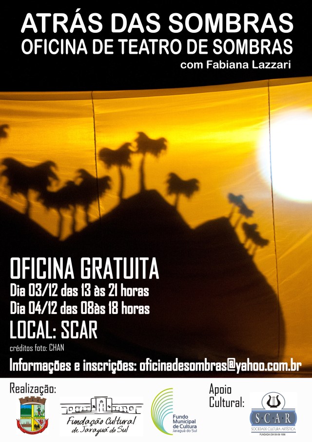 Porém antes, estarei em Jaraguá do Sul ministrando uma Oficina de Teatro de Sombras produzida por Ana Paula Moretti Pavanello Machado e financiada pelo fundo municipal de cultura de Jaraguá do Sul! Será um final de semana em imersão nas sombras!